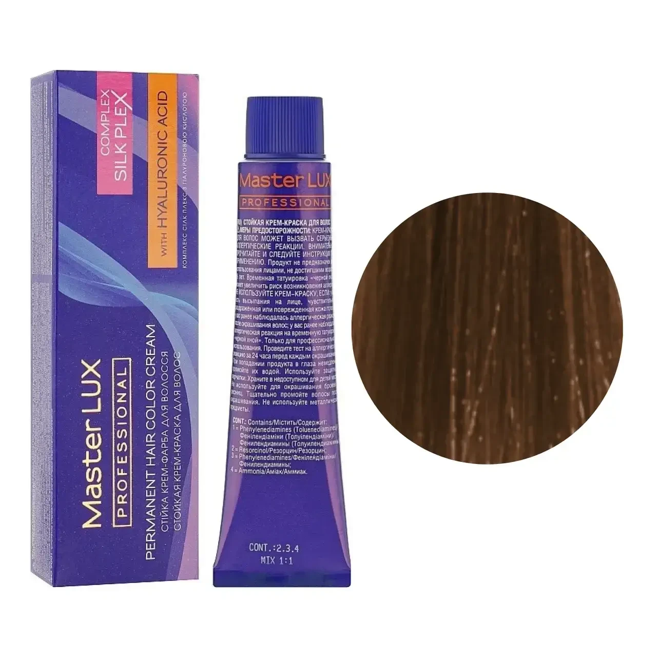 Для того щоб результат фарбування радував якнайдовше, слід використовувати стійку, професійну крем-фарбу від Master LUX. Фарба для волосся Master LUX professional з гіалуроновою кислотою та комплексом SILK PLEX придатна для стійкого, насиченого та сяючого відтінку локонів. Бережні компоненти SILK PLEX та гіалуронова кислота у поєднанні зі спеціальними барвниками забезпечують глибоке проникнення крем-фарби у структуру волосся, зміцнюють та захищають їх від пошкоджень під час процедури фарбування. Комплекс на основі протеїнів та амінокислот утворює щільну молекулярну сітку, що дозволяє досягти насиченого, стійкого кольору в результаті фарбування. Гіалуронова кислота сприяє інтенсивному зволоженню та відновленню структури волосся, надає їм гладкість, еластичність та красивий блиск!