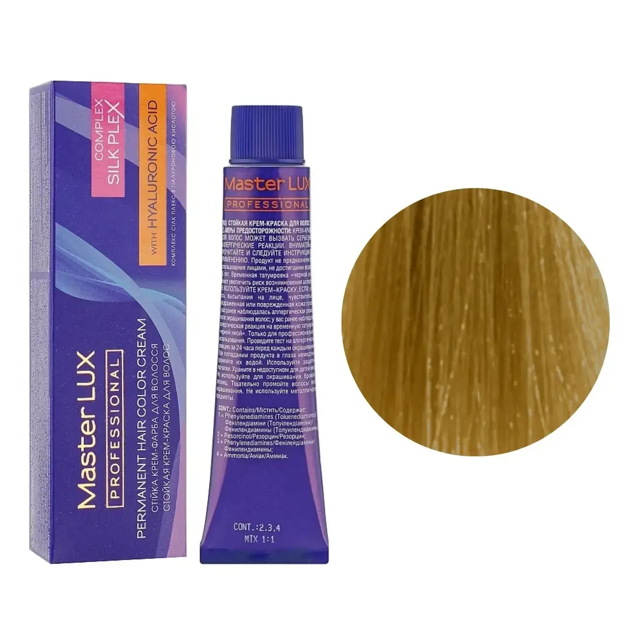 Для того щоб результат фарбування радував якнайдовше, слід використовувати стійку, професійну крем-фарбу від Master LUX. Фарба для волосся Master LUX professional з гіалуроновою кислотою та комплексом SILK PLEX придатна для стійкого, насиченого та сяючого відтінку локонів. Бережні компоненти SILK PLEX та гіалуронова кислота у поєднанні зі спеціальними барвниками забезпечують глибоке проникнення крем-фарби у структуру волосся, зміцнюють та захищають їх від пошкоджень під час процедури фарбування. Комплекс на основі протеїнів та амінокислот утворює щільну молекулярну сітку, що дозволяє досягти насиченого, стійкого кольору в результаті фарбування. Гіалуронова кислота сприяє інтенсивному зволоженню та відновленню структури волосся, надає їм гладкість, еластичність та красивий блиск!